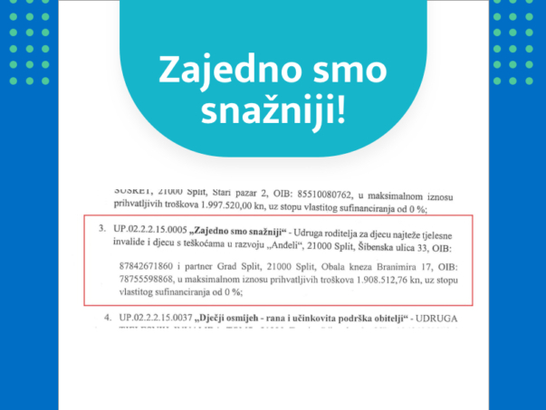 Udruga Anđeli s ponosom objavljuje da je zajednička suradnja Udruge, Grada Splita i Razvojne agencije Grada Splita(RaST) ostvarila fantastičan uspjeh. U sklopu ESF natječaja „Unaprjeđenje postojećih i širenje usluga izvaninstitucionalne skrbi na području odabranih urbanih aglomeracija/područja Osijek, Pula, Rijeka, Slavonski Brod, Split, Zadar i Zagreb odobren je projekt „ZAJEDNO SMO SNAŽNIJI“